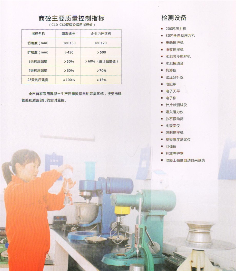 公司設(shè)有先進(jìn)的實驗室,配備全套混凝土及原材料檢測試驗設(shè)備,配有專職的試驗、檢驗人員,可承擔(dān)混凝土的材料性能試驗,工藝質(zhì)量控制、產(chǎn)品質(zhì)量檢驗等全部試驗、檢驗項目,為確保混凝土質(zhì)量提供了可靠的保證。